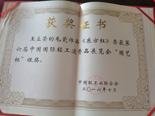 作品《万众一心齐向党》获得全国新华书画大赛银奖(最高奖奖金12万),作品《东方红》获得全国轻工业工艺家大赛银奖(四年一届),作品《祖国颂》人民大会堂展览收藏,作品《中华之光》获建党九十周年全国大展银奖,作品《欣欣向荣》获得毛泽东诞辰120周年全国大展金奖。