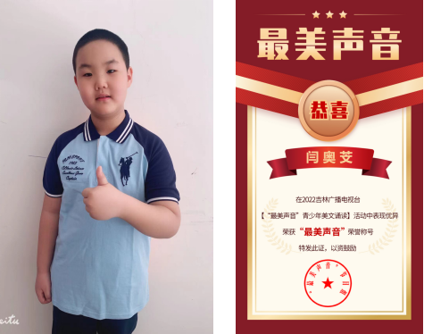 五十六中学二年四班闫奥芠同学表示:“很荣幸在‘最美声音’青少年美文诵读活动中获奖,当接到这一消息的时候,我的心里乐开了花!因为这份惊喜为我们这段时间线上学习、居家抗疫生活增添了新的动力!在这里首先我要感谢节目组为我们搭建展示的平台;其次要感谢我的学校长春市第五十六中学校长和班主任罗老师的细心指导和帮助,让我有足够的信心和勇气坚持下去,成就更好的自己;再次要感谢我的同学们,对我的关心及帮助;最后我还要感谢我的家人,给予我的支持和肯定。通过参加这次活动,让我深刻体会到参与就有机会展示自己,在准备的过程中锤炼、提升自己,只要珍惜了、努力了,就会成功!以后的生活中我会努力做最好的自己!”
