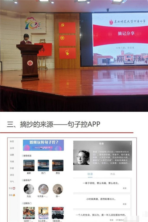 六年五班刘秋婷、六年六班的孙宜家同学结合自己的预习笔记与积累打卡本,从同学们详细、具体地介绍了可以从哪些方面预习内容和名言警句的积累来源。