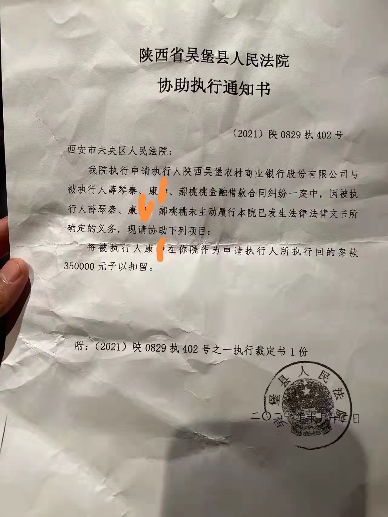 吴堡法院没有立即执行借款人,而是当天出具《协助执行通知书》扣留康女士在未央法院执行款35万。