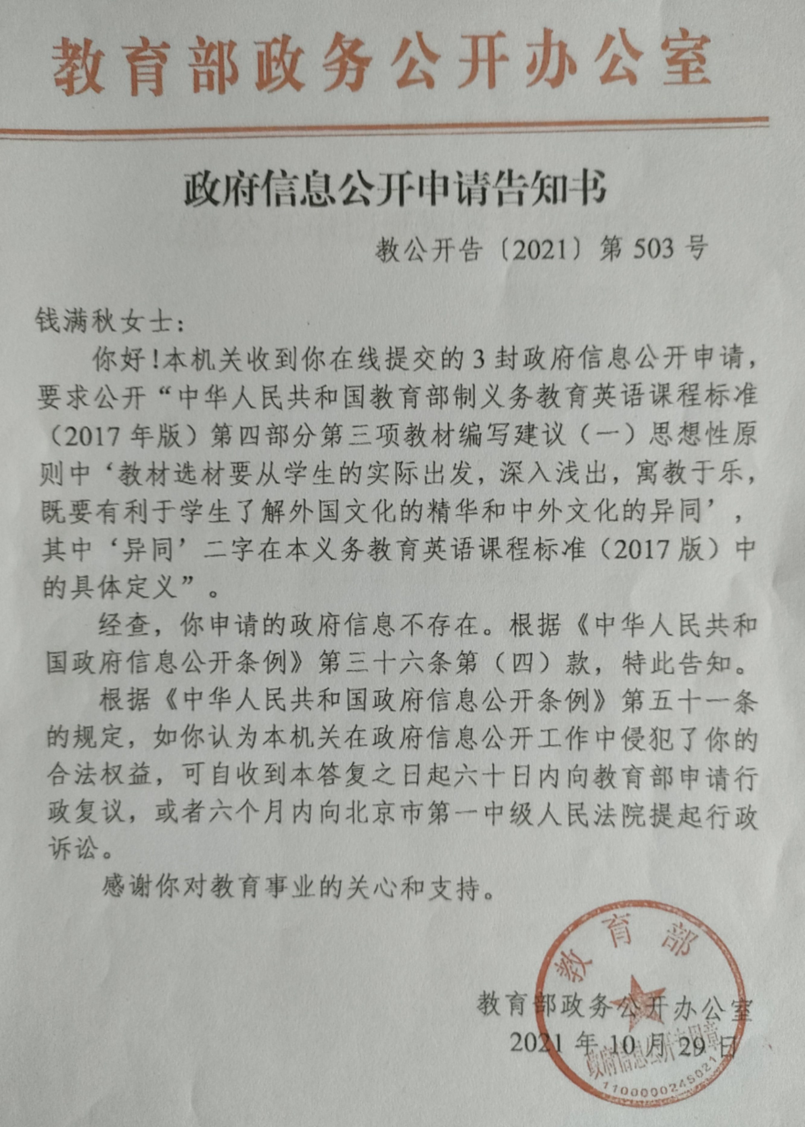 钱一认为,2017年版是全国3亿多中小学生英语学习的指南,思想性原则则是英语教材编写、英语课程目标设定和英语教学思维方法的指导,应贯穿英语学习的始终,按理不应该存在模糊概念。因此,2021年10月20日,她向国家教育行政主管部门在线提交了3封政府信息公开申请,要求公开“异同”二字在2017年版中的具体定义。