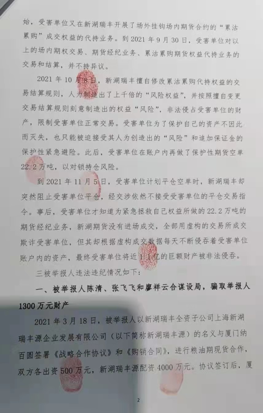 中国三农观察网据新华焦点网消息:我是厦门纳百圆商贸有限公司法定代表人,现实名举报新湖期货股份有限公司全资子公司上海新湖瑞丰金融服务有限公司总经理陈清、新湖瑞丰副总经理张飞飞、新湖瑞丰场外衍生品总监廖祥云等高管合谋骗取客户数千万资金!