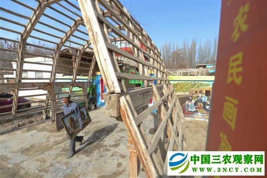 在新疆墨玉县库木艾日克村,阿卜力克木·麦麦提敏抱着顾客订购的油画走出家门(3月6日摄)。新华社发(丁磊 摄)