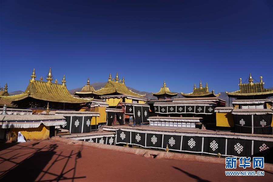 修缮后的布达拉宫金顶群(11月7日摄)。布达拉宫金顶群修缮工程于近日通过专家验收,标志着历时一年半的布达拉宫金顶群及附属修缮工程圆满结束。布达拉宫建筑顶层共有七座金顶,由于长年风吹日晒、雨水渗透等原因,金顶群出现残损,导致金顶外部鎏金脱落氧化变黑、内部木构件受雨水侵蚀等。2016年,根据布达拉宫管理处申报修缮项目的申请,国家文物局先后拨款3100余万元,于2017年正式启动了布达拉宫顶层7座金幢、7座宝瓶以及五世、七世、八世和九世达赖灵塔殿及帕巴拉康殿五座金顶的修缮工程。新华社记者普布扎西摄