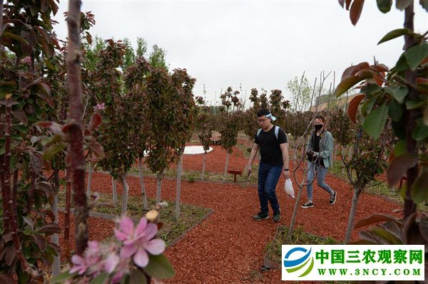 百果园中的“芭蕾苹果迷宫”吸引了躲避人群的情侣在其中漫步。因果树开花时的风姿宛如芭蕾舞女,“芭蕾苹果”因此得名。它是上世纪90年代我国从英国引进的新型苹果品种,其枝短,冠形小且紧凑,花冠呈艳丽的胭脂红色,是苹果中难得的既可观花又可瞻果的观赏型品种。与人们平时常见的苹果树有很大的不同。