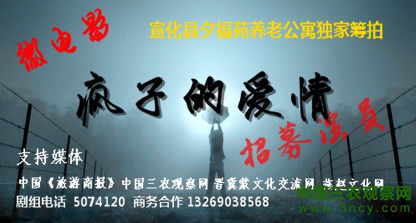 中国三农观察网7月11日讯:(韩笑  石川)由张家口市唯一一家精神病患者、老年痴呆症托管康复中心、宣化县夕福苑养老公寓筹划拍摄的微电影《疯子的爱情》即将在张家口市开拍。目前已经进入演员招募阶段。