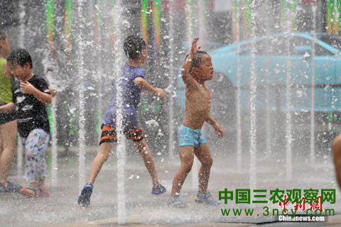 7月20日,北京天气炎热,孩子们在喷泉中嬉水纳凉。