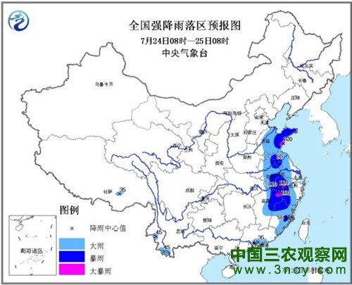 中央气象台7月24日6时继续发布暴雨橙色预警:预计,7月24日8时至25日8时,福建大部、浙江中西部、江西东部、安徽大部、江苏大部、山东大部等地有大雨或暴雨,其中,江西东北部、浙江西部、安徽南部、山东半岛西南部等地的局部地区有大暴雨(100~180毫米);另外,云南西南部、广东南部等地的部分地区有大雨(25~45毫米)。