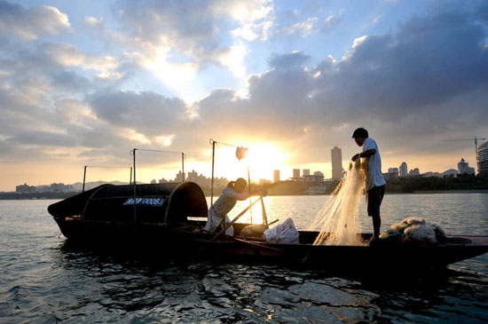 2012年7月10日清晨,广西柳州,渔船上挂猪肉作为诱饵的渔网,渔民再次出发准备下网。