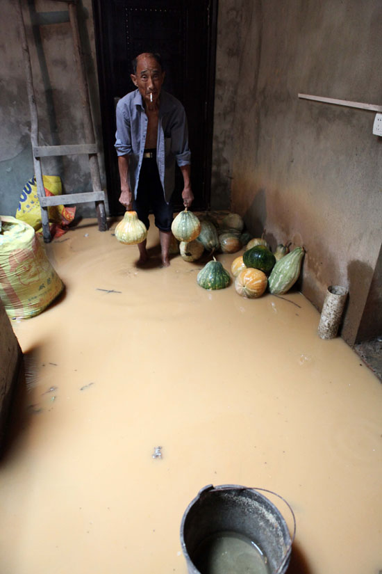 7月17日,江西省九江市都昌县多宝乡细陈湾村村民在家里搬运被洪水淹浸的南瓜。新华网(傅建斌 摄)