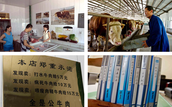 左上:市民在“农超对接”牛肉产品商店买肉。左下:“农超对接”牛肉商店内“假一赔万”的招牌。右上:密山市一家“农超对接”的肉牛养殖基地。右下:养殖基地内的肉牛防疫、牛舍消毒等各种记录(均摄于7月18日)。
