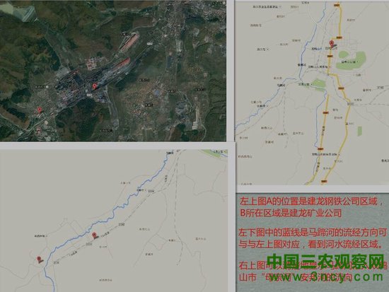 在两侧低山,中间是马蹄河的河谷地貌之中,建龙钢铁、化工和矿业绵延数里。企业规模谓之可观。在此,我们亲眼见识了冒着白、黄、青、红等色彩的烟(汽)雾。企业附近的建筑物的灰色屋顶被刚刚下过的雨水冲刷,露出了一块块的“红斑”。原来这些建筑物的屋顶是红色的彩钢瓦!我们沿着马蹄河水流而下,看到在建龙企业上段清亮的马蹄河水流经建龙企业之后变成黑色的浊汤……