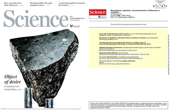 本网讯 11月29日,从中国农业科学院蔬菜花卉研究所和深圳农业基因组研究所在京联合举行的新闻发布会上获悉,由蔬菜所研究员、基因组所副所长黄三文领导的科研团队通过历经5年的研究发现了黄瓜苦味合成、调控及驯化的分子机制。这项研究揭开了黄瓜变苦的秘密,为将来培育无苦味黄瓜新品种和开发合成抗癌药物——苦味物质葫芦素迈出了关键一步。最新一期的国际顶级学术期刊《科学(Science)》杂志以长篇幅论文的形式发表了这一研究成果。