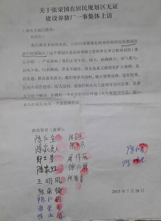 自从养猪场建成后,附近的居民就生活在恶臭熏天、污水横流、蚊蝇成群的环境里,这不仅严重损害了村民的身心健康,也严重影响乡村环境,还污染了村里的饮用水源,无奈之下,村民们曾多次找到张荣国本人及高塘镇政府领导、县国土局以及县环保部门,虽然不时有人前往实地查看,但每次都不了了之,问题得不到解决。