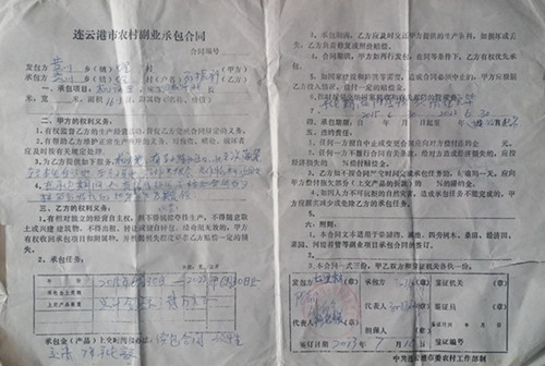 孙振科早在2010年6月就与七里村村民委员会签订村里四农路北的村机动地16.3亩,合同期限5年,搞地瓜、花生、玉米、黄豆、萝卜等农作物种植。合同今年到期后孙振科又与七里村村民委员会签订续包合同7年,即自2015年6月30日到2022年6月30日止,在他与七里村村民委员会签订的连云港市农村副业承包合同中,承包项目:机动田,16.3亩,该机动地南至小路北边口,北至灌溉渠,东至本组自留地,西至小耳地,只作为粮食、农作物种植用地。在承包期间如有集体征用或终止合同的,按每亩收入的50%作为赔偿金。续包合同一次性交清7年承包金两万元整。
