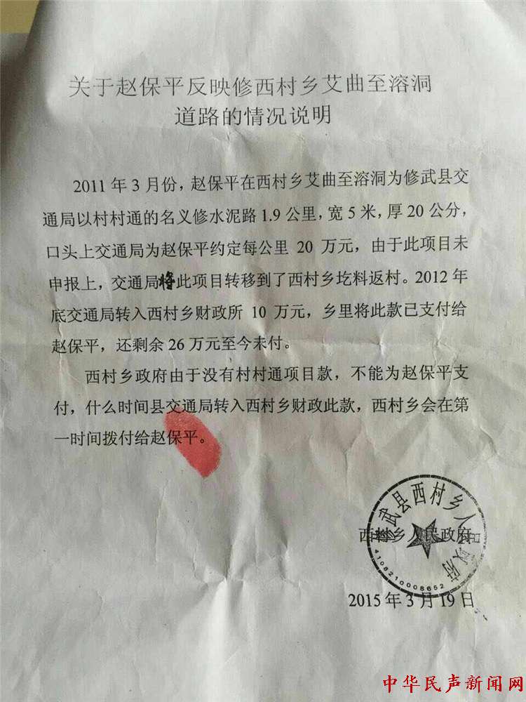 中华民声新闻网讯;近日,记者接到修武县郇封镇万箱铺村赵保平反映,称自己于2011年3月组织本村村民修路,然而4年过去了,修武交通局与西村乡政府相推诿,迟迟拿不到26万元工程款。