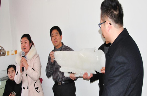 ![]() 中国著名陶瓷工艺美术大师、张玮(右2)向中国传媒联盟☆一亩园事业部 赠送骨质瓷 ![]() 雕塑大师 杨新德(左) 向中国传媒联盟☆一亩园事业部 赠送商丘樽盘