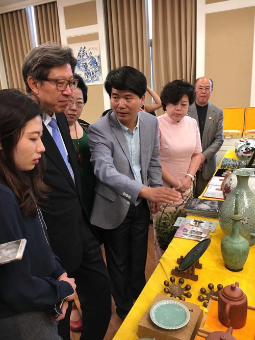 济州论坛上著名书法教育家闫锐敏和非遗战略发展联盟华庆秘书长高度评价百刹紫砂壶
