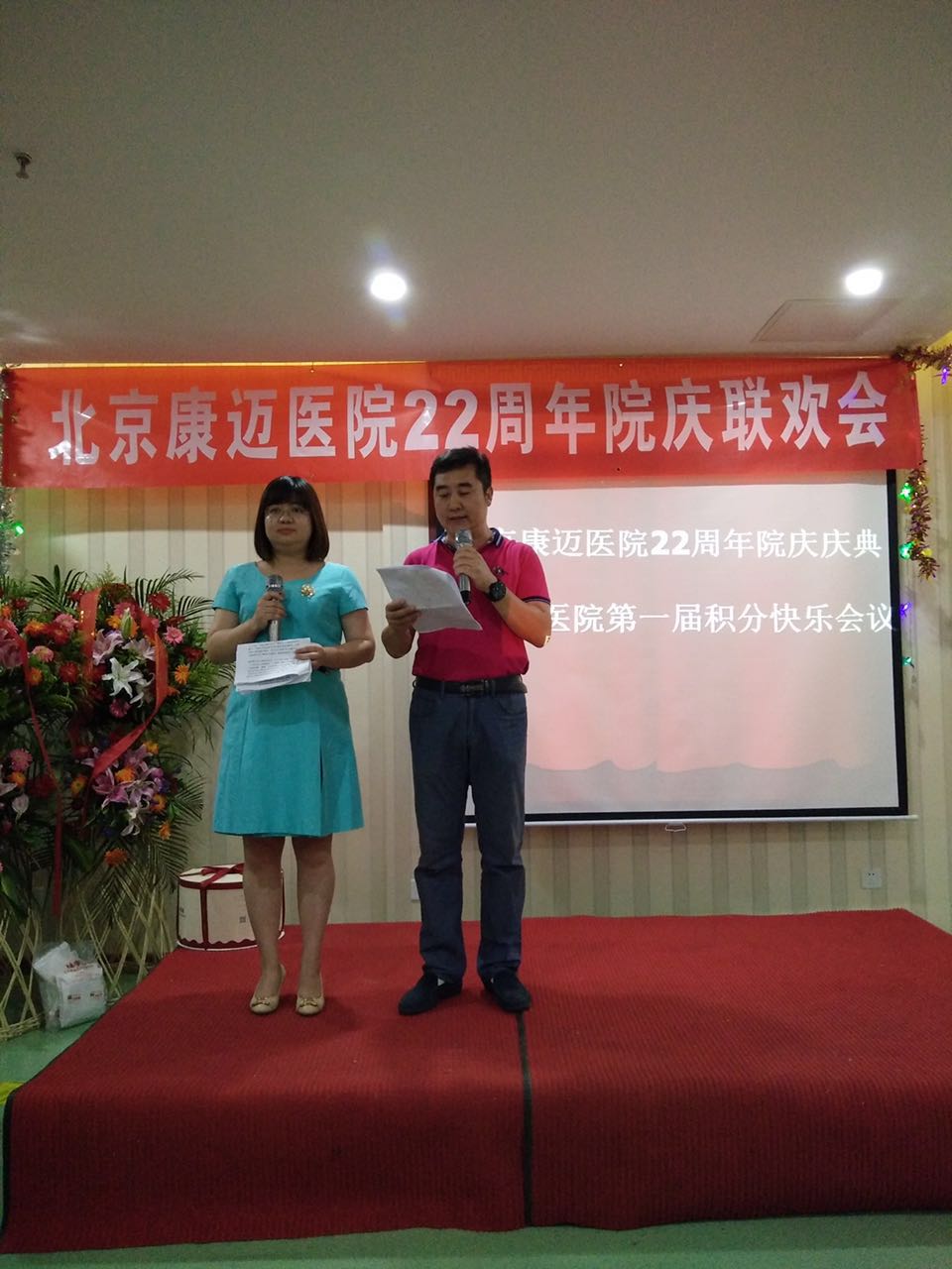 2016年6月18日晚18:00,北京康迈医院22周年院庆典暨康迈医院第一届积分快乐会议在京举行。会议在康迈医院全体员工同唱院歌《生命的阳光》的歌声中拉开了序幕,康迈全体员工为大家献上了各种各样的文艺汇演。参会人员除了康迈全体员工,还特别邀请了爱心中国网创始人海合龙祥先生,还有神秘嘉宾:星光大道著名盲人歌手—杨光、星光大道人气王—柴静、著名唱作人—李济纶先生、影视明星经纪人薛潇迪女士等大批爱心人士参与。会议得到了临沂振兴国际旅行社有限公司总经理姚振兴先生、嘉事瑞康(北京)医药有限公司总经理王宇先生等爱心企业家的大力支持!
