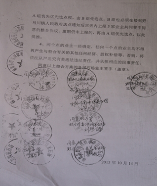 到了2016年春节后,企业负责人的爱人才在野马川镇政府通过管这个事的政法委书记递过来的一张表,看到“抓阄”整合的游戏规则。(见图)