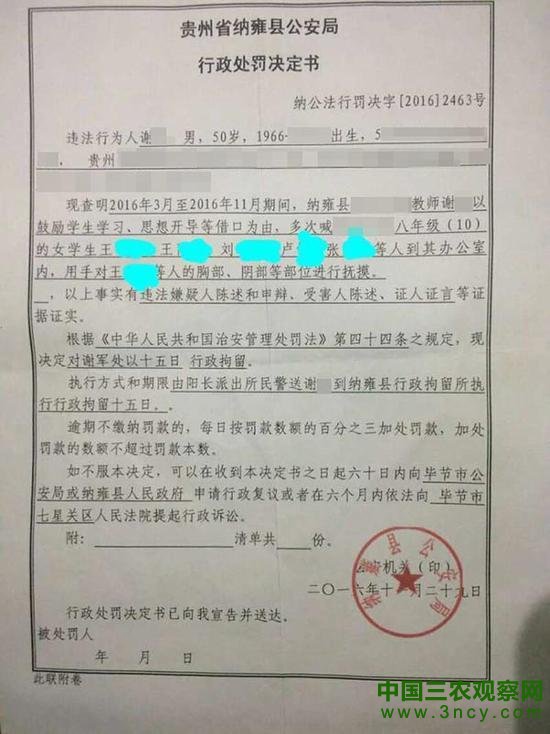 澎湃新闻从经过纳雍县公安局证实、盖有该县公安局红色公章的《行政处罚决定书》看到:2016年3月至11月期间,纳雍县某中学教师谢军以鼓励学生学习、思想开导等借口为由,多次将八年级(10)班的5名女生喊到其办公室,用手抚摸其胸部和阴部。警方依据《中华人民共和国治安管理处罚法》第四十四条之规定,对谢军处以十五日行政拘留。
