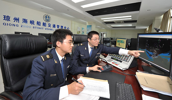 12月20日,海口海事局的执法人员在琼州海峡船舶交通管理中心对运输瓜菜的船舶实施重点监控。