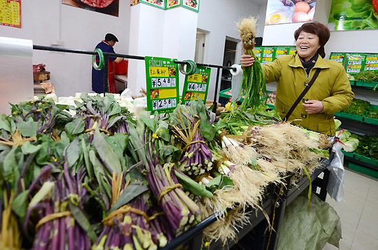 近日,我国南方多地迎来降雪天气。以往农副产品价格基本“逢雪必涨”,但记者在江西南昌部分市场走访发现,得益于农副产品“农社对接”,当地一些社区菜价并未出现较大波动。 为缓解农民“卖菜难”和居民“买菜贵”的矛盾,南昌市在新年前推出首批40余家农副产品平价商店,启动农副产品“农社对接”的直销试点工作,将各类农副产品“打包”送进社区,不仅为百姓提供基本生活必需的农副产品,而且每天会有不少于10种以上的蔬菜,以低于市场平均价15%以上的优惠价格供应。如遇市场上农副产品价格发生异常波动时,平价商店还会保证严格执行政府的价格调控措施,为稳定市场价格服务。 新华社记者 周科 摄