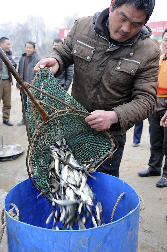 1月16日,四川南充市高坪区渔业工作人员把水罐车里的鱼苗倒入桶中,准备放流嘉陵江。