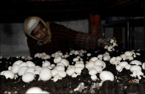 广西横县朝南村农民在蘑菇工厂化生产基地采摘新鲜蘑菇。