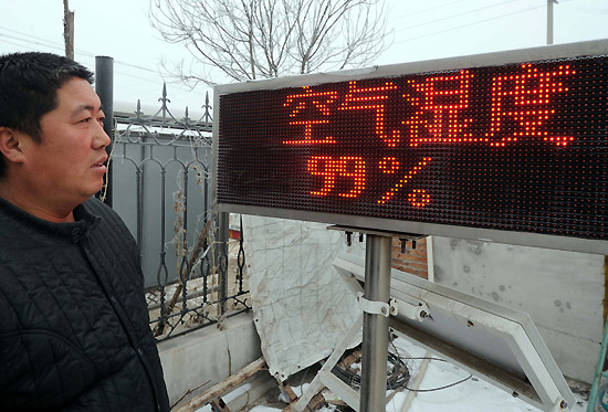 1月29日,三河市一位菜农在显示屏上观察“设施农业小气候观测站”提供的气候数据。