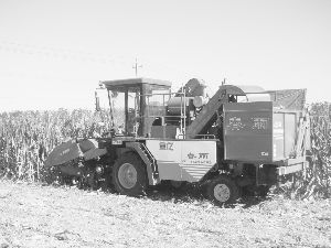 鸿飞大沽河农场联合收割机在收割玉米。 本报资料图片
